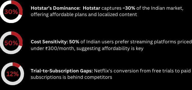 Netflix is the world’s leading streaming platform with a mission “to entertain the world” and a vision “to continue being one of the leading firms in the internet entertainment era.” In India, however, Netflix faces the challenge of slowing user growth. Despite its premium content, the competitive streaming market, particularly with regional platforms like Hotstar, is challenging Netflix’s position. High subscription costs and a lack of localized features make it difficult for Netflix to convert free trial users into paying, loyal subscribers.