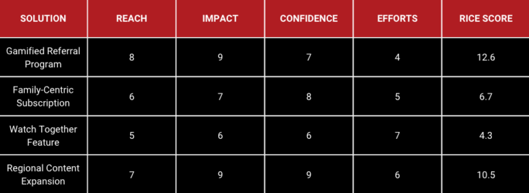 To objectively evaluate and prioritize these solutions, we applied the RICE framework (Reach, Impact, Confidence, Effort):